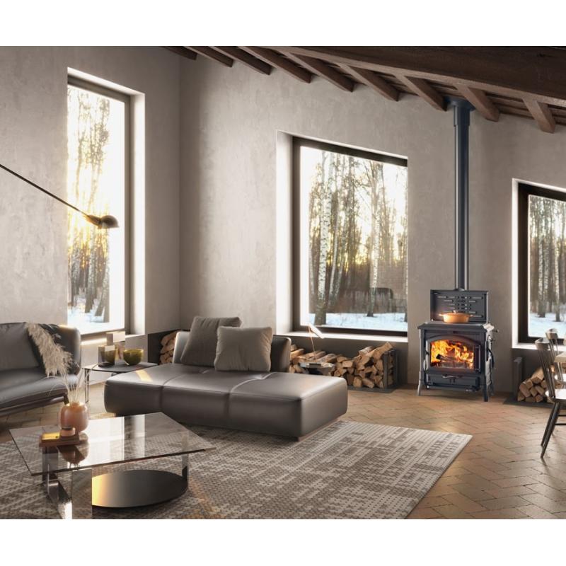 Der Holzofen Isotta con cerchi Evo der Marke La Nordica bietet Ihnen die Möglichkeit, Ihr Zuhause bis zu 338 m3 zu heizen. Die Verkleidung des Holzofens Isotta con cherchi Evo besteht vollständig aus Gusseisen, was dem Produkt eine hohe Langlebigkeit und Stoßfestigkeit verleiht. Halten Sie alle Ihre Gerichte warm und kochen Sie sie auf der Platte über dem Herd.